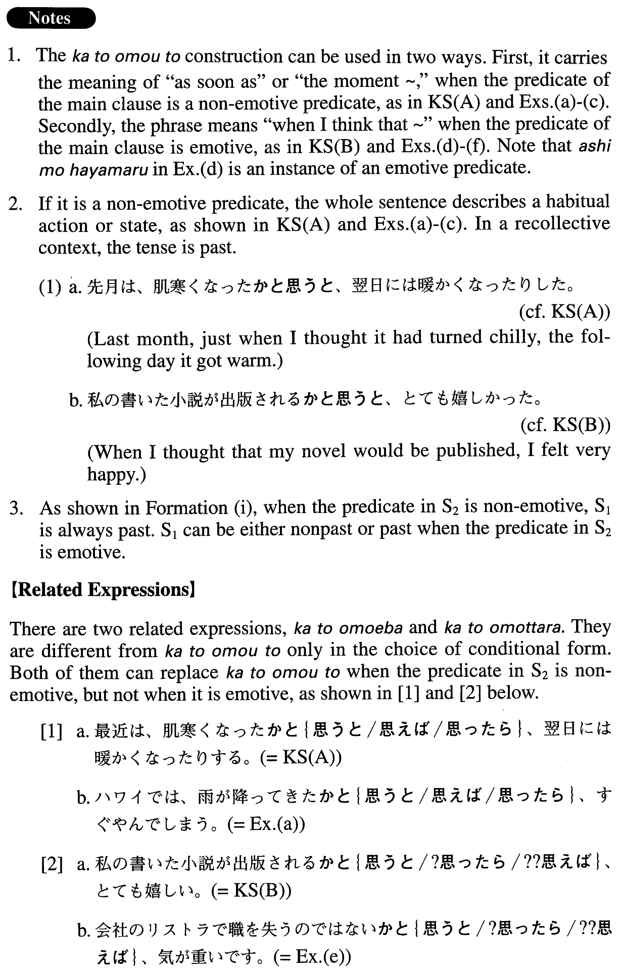 | (i) Sentence1 informal past | かと思うと、Sentence2 | Where the predicate in Sentence2 is non-emotive; the subjects in Sentence1 and Sentence2 are the same |