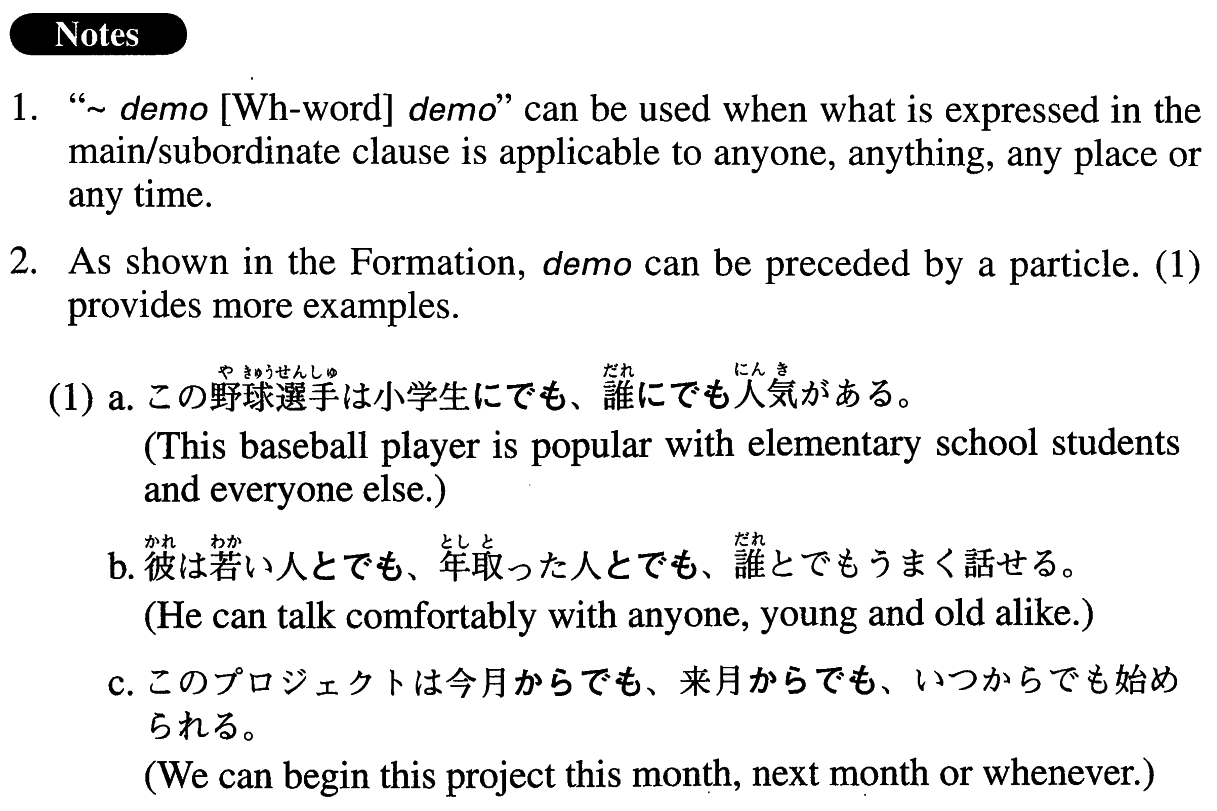 | Noun (particle) | でも, (Noun (particle) でも,) でも、Wh-word (particle) でも | |