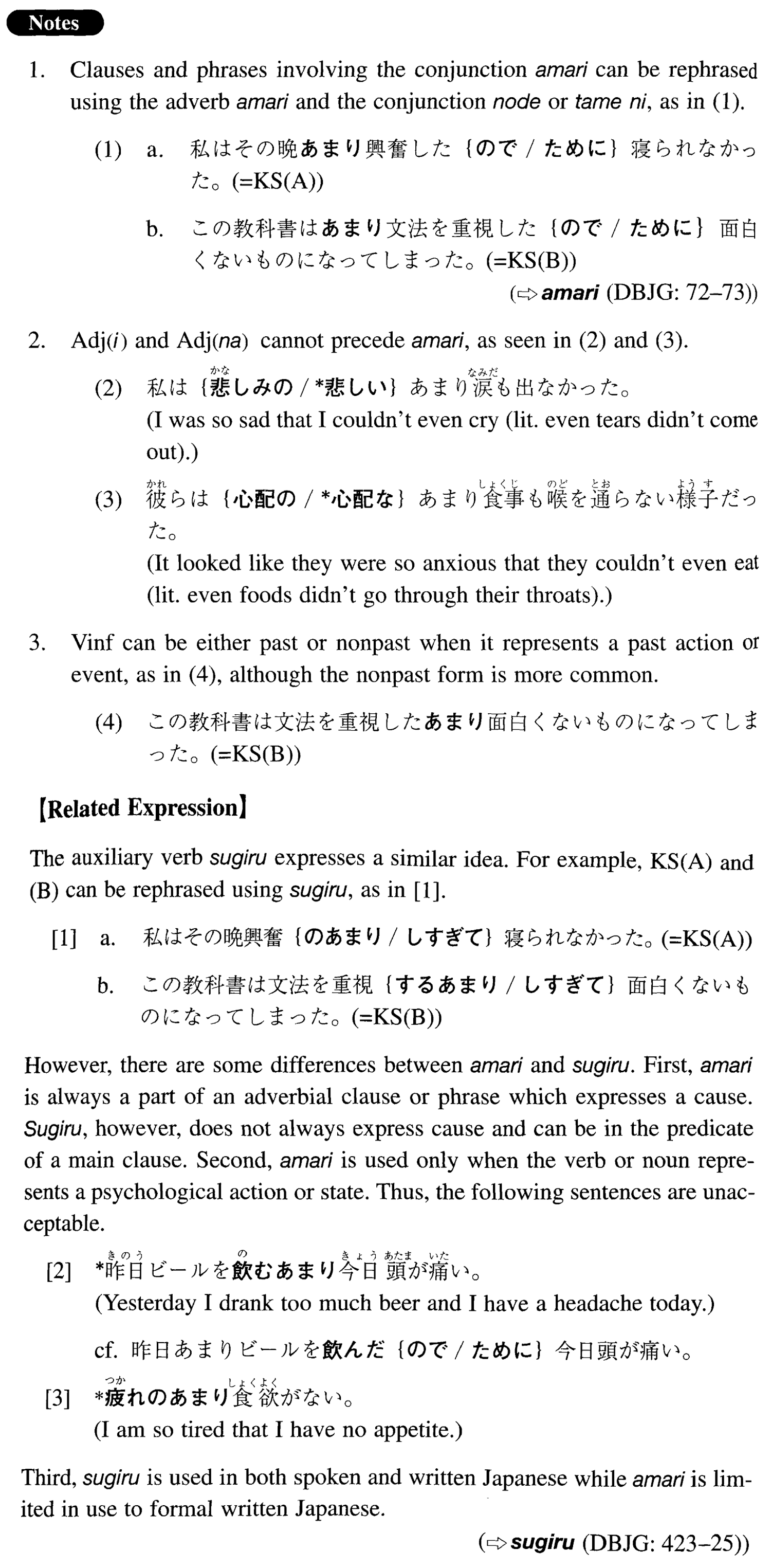 1. Clauses and phrases involving the conjunction あまり can be rephrased using the adverb あまり and the conjunction ので or ために, as in (1).