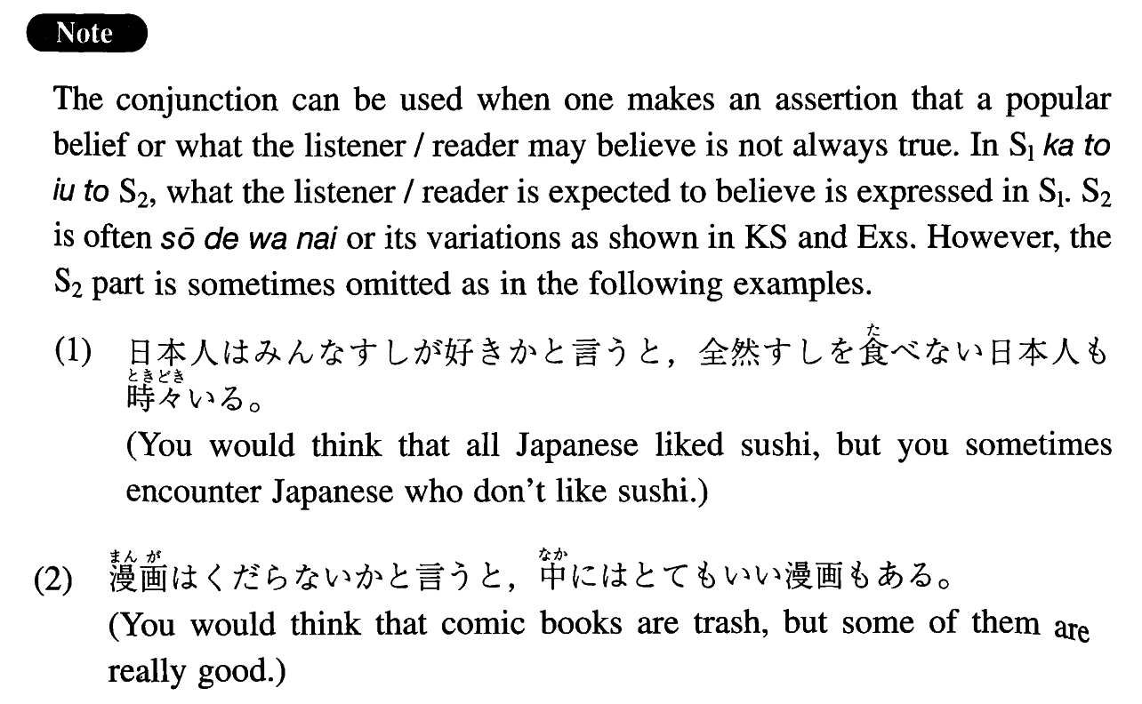 | (i) ~{V/Adjective い} informal | かと言うと、S | |