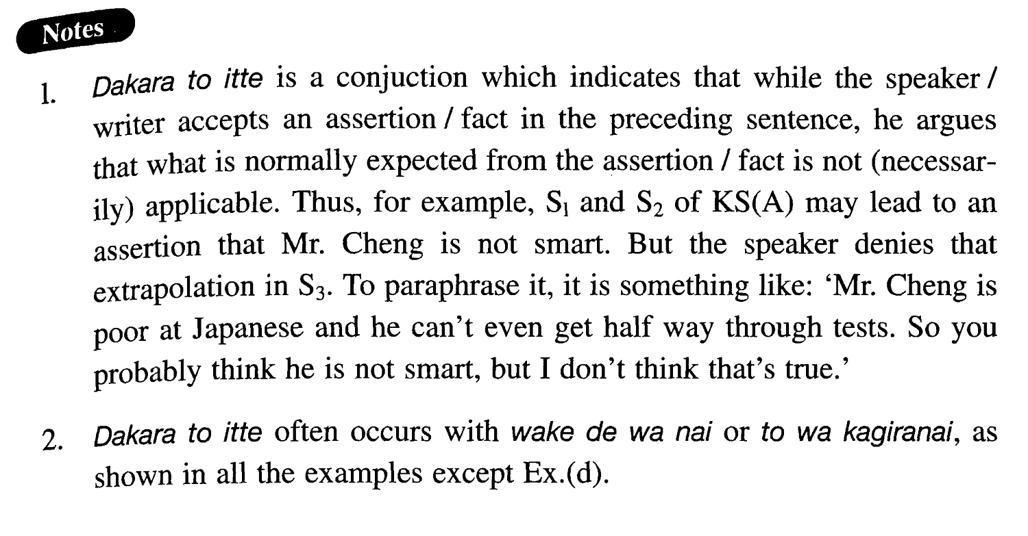 1. だからと言って is a conjuction which indicates that while the speaker/writer accepts an assertion/fact in the preceding sentence, he argues that what is normally expected from the assertion/fact is not (necessarily) applicable. Thus, for example, Sentence1 and Sentence2 of Key Sentence (A) may lead to an assertion that Mr. Cheng is not smart. But the speaker denies that extrapolation in Sentence3. To paraphrase it, it is something like: 'Mr. Cheng is poor at Japanese and he can't even get half way through tests. So you probably think he is not smart, but I don't think that’s true.'