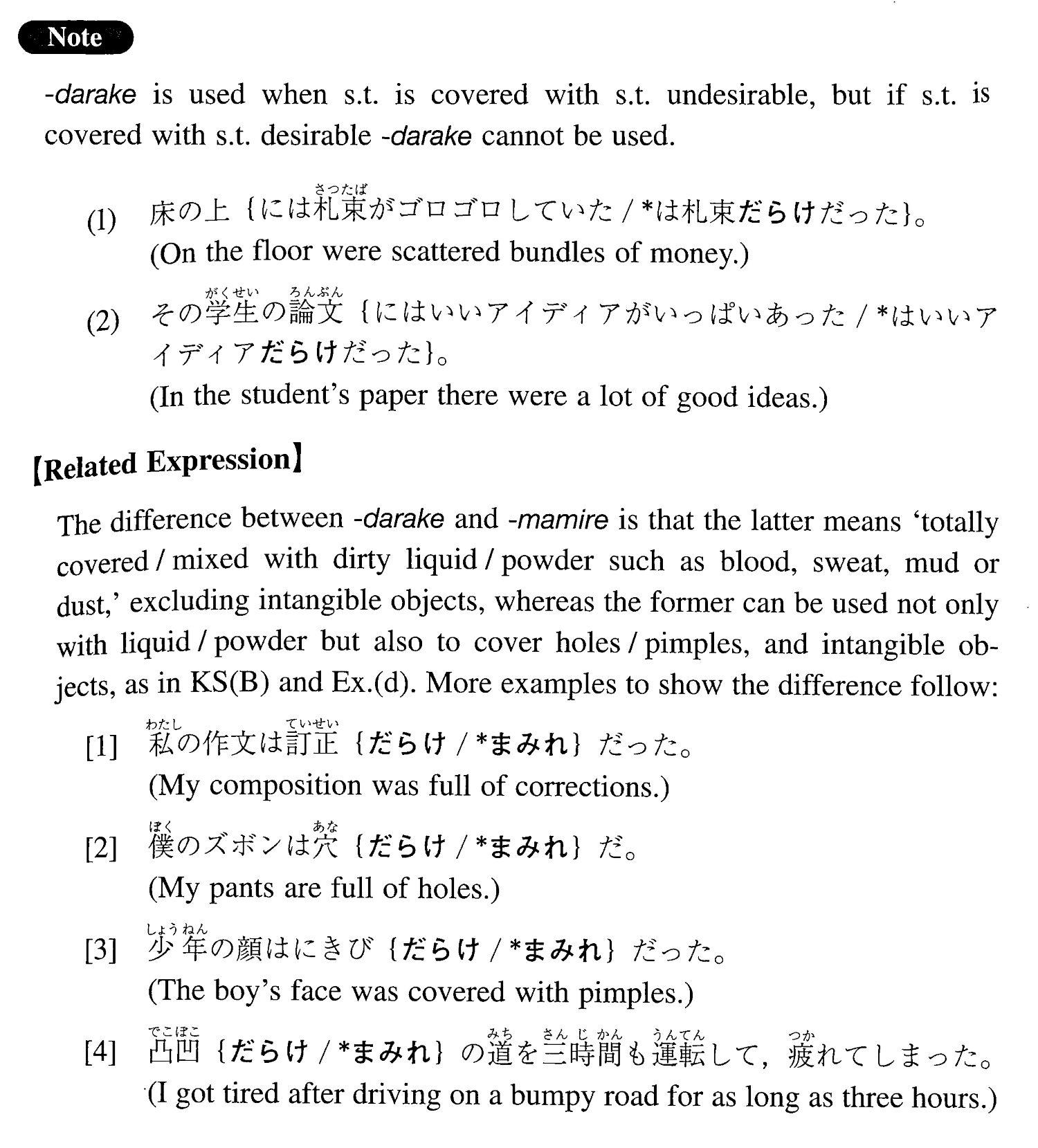 The difference between だらけ and まみれ is that the latter means 'totally covered/mixed with dirty liquid/powder such as blood, sweat, mud or dust,' excluding intangible objects, whereas the former can be used not only with liquid/powder but also to cover holes/pimples, and intangible objects, as in Key Sentence (B) and Example (d). More examples to show the difference follow: