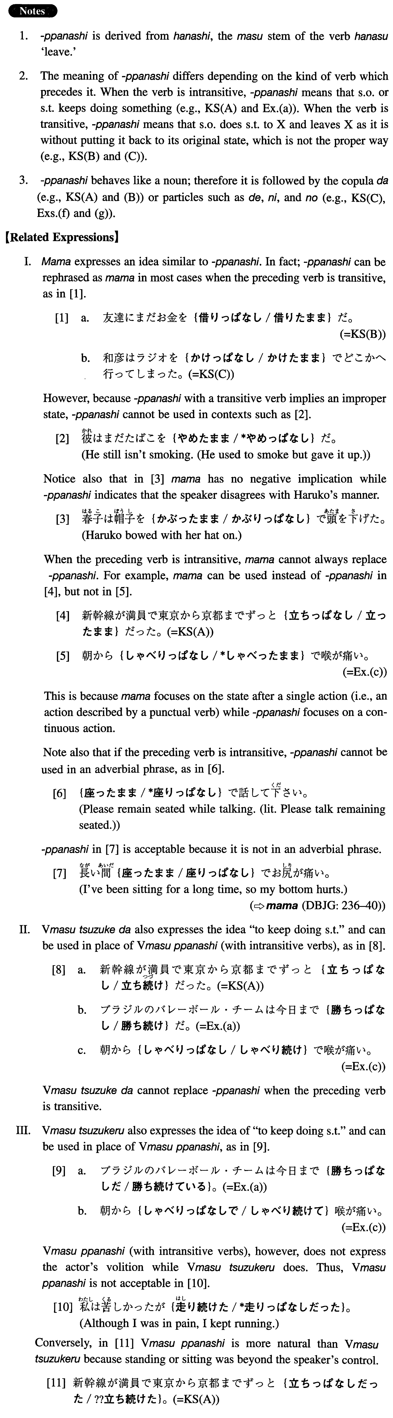 An auxiliary which expresses the idea that someone or something keeps doing something, or someone leaves something in an improper state.