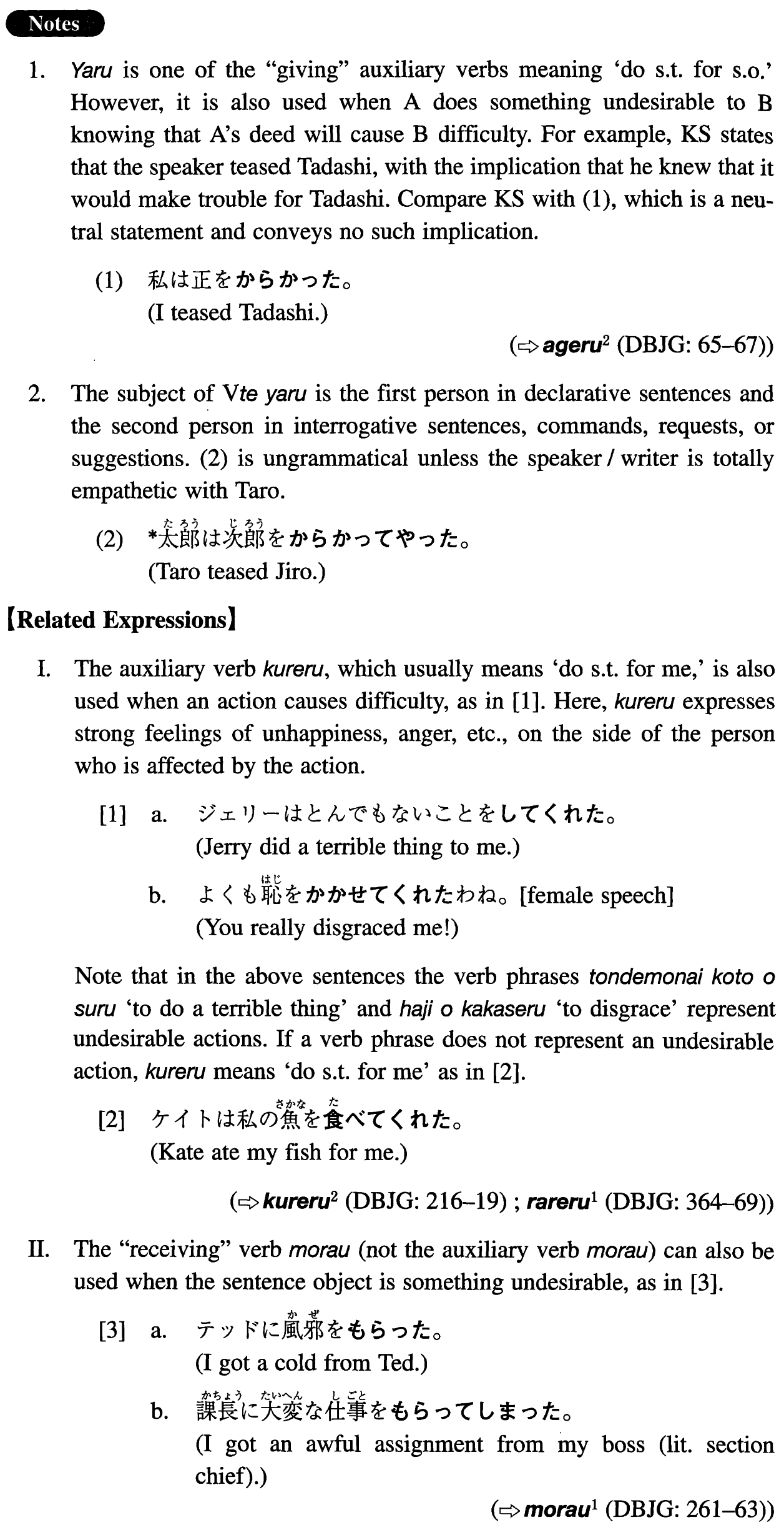 An auxiliary verb which expresses the idea that someone does something undesirable to someone else when he/she knows his/her action will cause hardship or trouble.