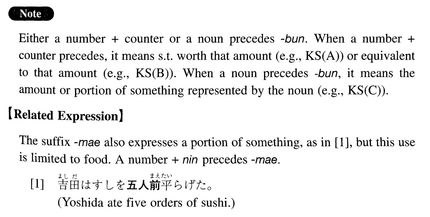 The suffix 前 also expresses a portion of something, as in [1], but this use is limited to food. A number+人 precedes 前.