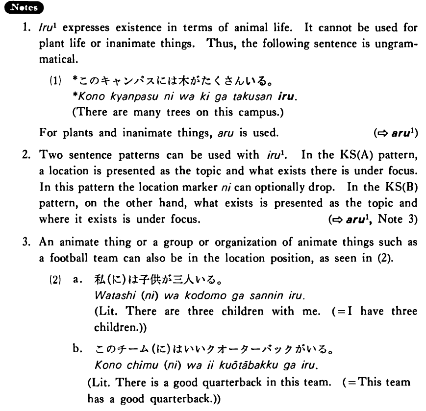 2. Two sentence patterns can be used with いる1. In the Key Sentence (A) pattern, a location is presented as the topic and what exists there is under focus. In this pattern the location marker に can optionally drop. In the Key Sentence (B) pattern, on the other hand, what exists is presented as the topic and where it exists is under focus.