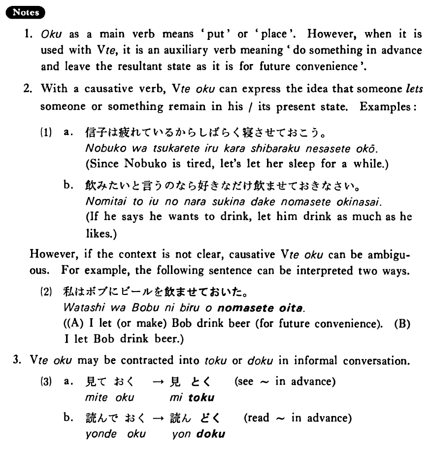 3. Verbておく may be contracted into とく or どく in informal conversation.