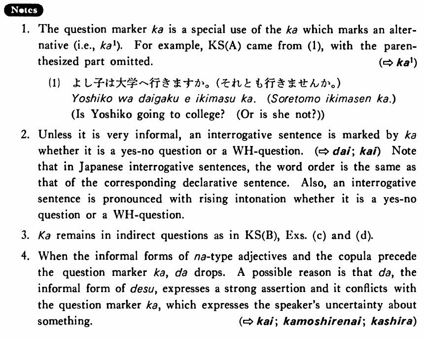2. Unless it is very informal, an interrogative sentence is marked by か whether it is a yes-no question or an interrogative word question. (⇨ だい; かい) Note that in Japanese interrogative sentences, the word order is the same as that of the corresponding declarative sentence. Also, an interrogative sentence is pronounced with rising intonation whether it is a yes-no question or a interrogative word question.