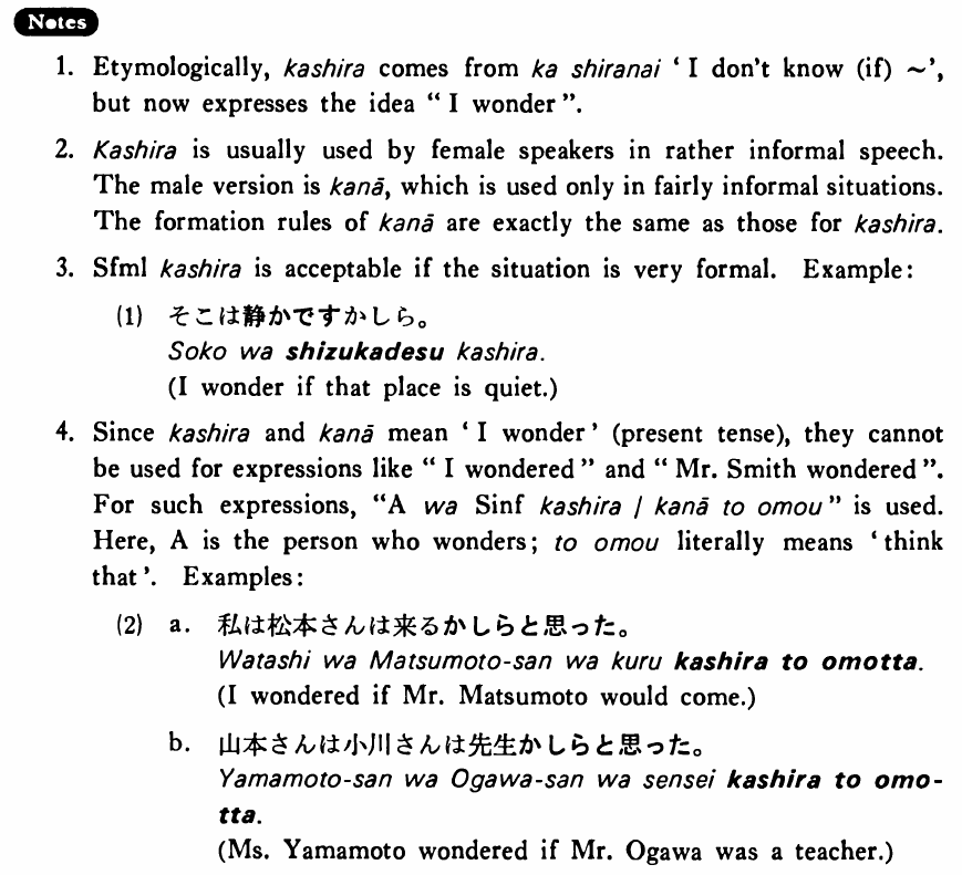 | (i) {V/Adjective い} informal | かしら | |