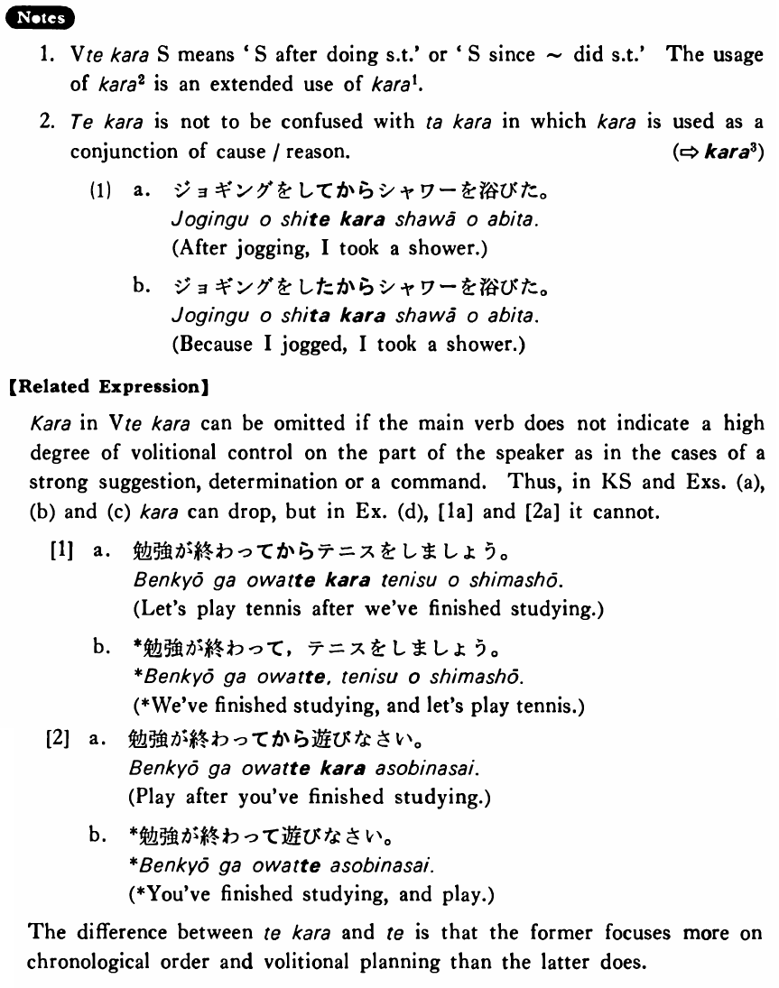 1. Verbてから Sentence means 'Sentence after doing something' or 'Sentence since ~ did something'. The usage of から2 is an extended use of から1.