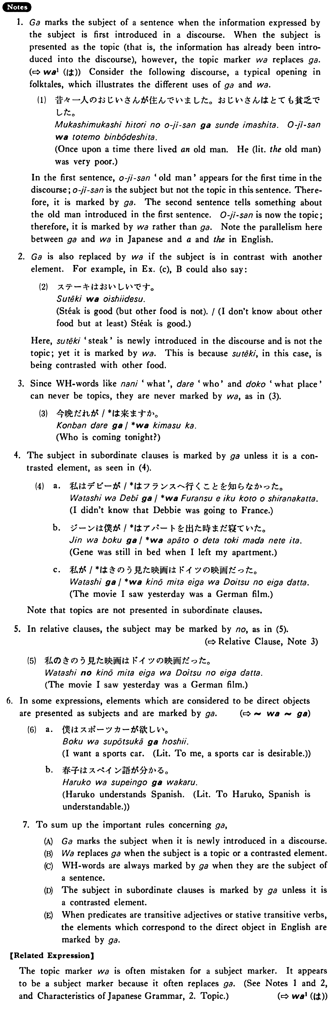 1. marks the subject of a sentence when the information expressed by the subject is first introduced in a discourse. When the subject is presented as the topic (that is, the information has already been introduced into the discourse), however, the topic marker は replaces . (⇨ は1) Consider the following discourse, a typical opening in folktales, which illustrates the different uses of and は.