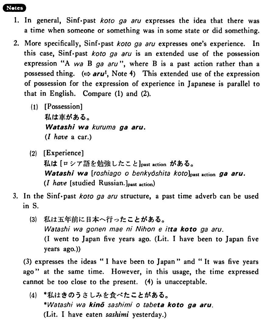 2. More specifically, Sentence informal past ことがある expresses one's experience. In this case, Sentence informal past ことがある is an extended use of the possession expression "AはBがある", where B is a past action rather than a possessed thing. (⇨ ある1, Note 4) This extended use of the expression of possession for the expression of experience in Japanese is parallel to that in English. Compare (1) and (2).