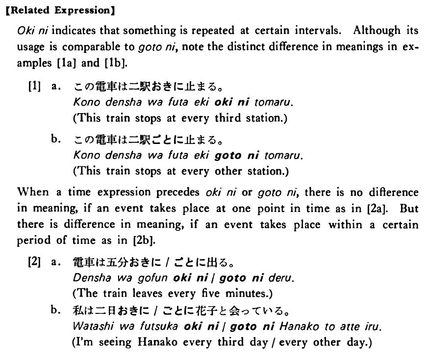 おきに indicates that something is repeated at certain intervals. Although its usage is comparable to ごとに, note the distinct difference in meanings in examples [1a] and [1b].
