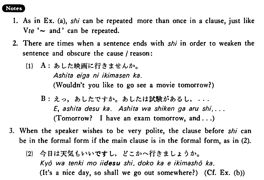 1. As in Example (a), し can be repeated more than once in a clause, just like Verbて '~ and' can be repeated.