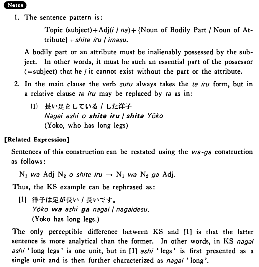 The only perceptible difference between Key Sentence and [1] is that the latter sentence is more analytical than the former. In other words, in Key Sentence 長い足 'long legs' is one unit, but in [1] 足 'legs', is first presented as a single unit and is then further characterized as 長い 'long'.