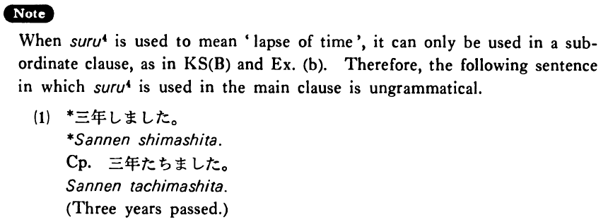 When する4 is used to mean 'lapse of time', it can only be used in a subordinate clause, as in Key Sentence (B) and Ex. (b). Therefore, the following sentence in which する4 is used in the main clause is ungrammatical.