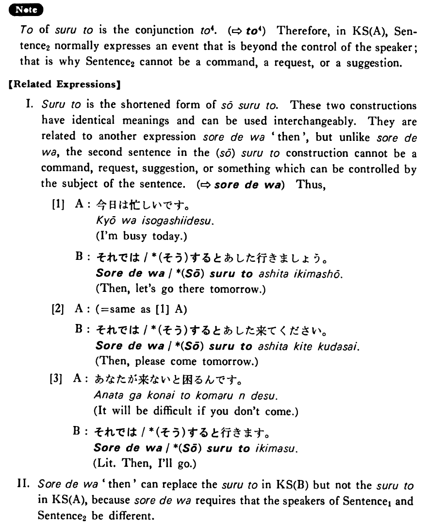 と of すると is the conjunction と4. (⇨ と4) Therefore, in Key Sentence (A), Sentence2 normally expresses an event that is beyond the control of the speaker; that is why Sentence2 cannot be a command, a request, or a suggestion.