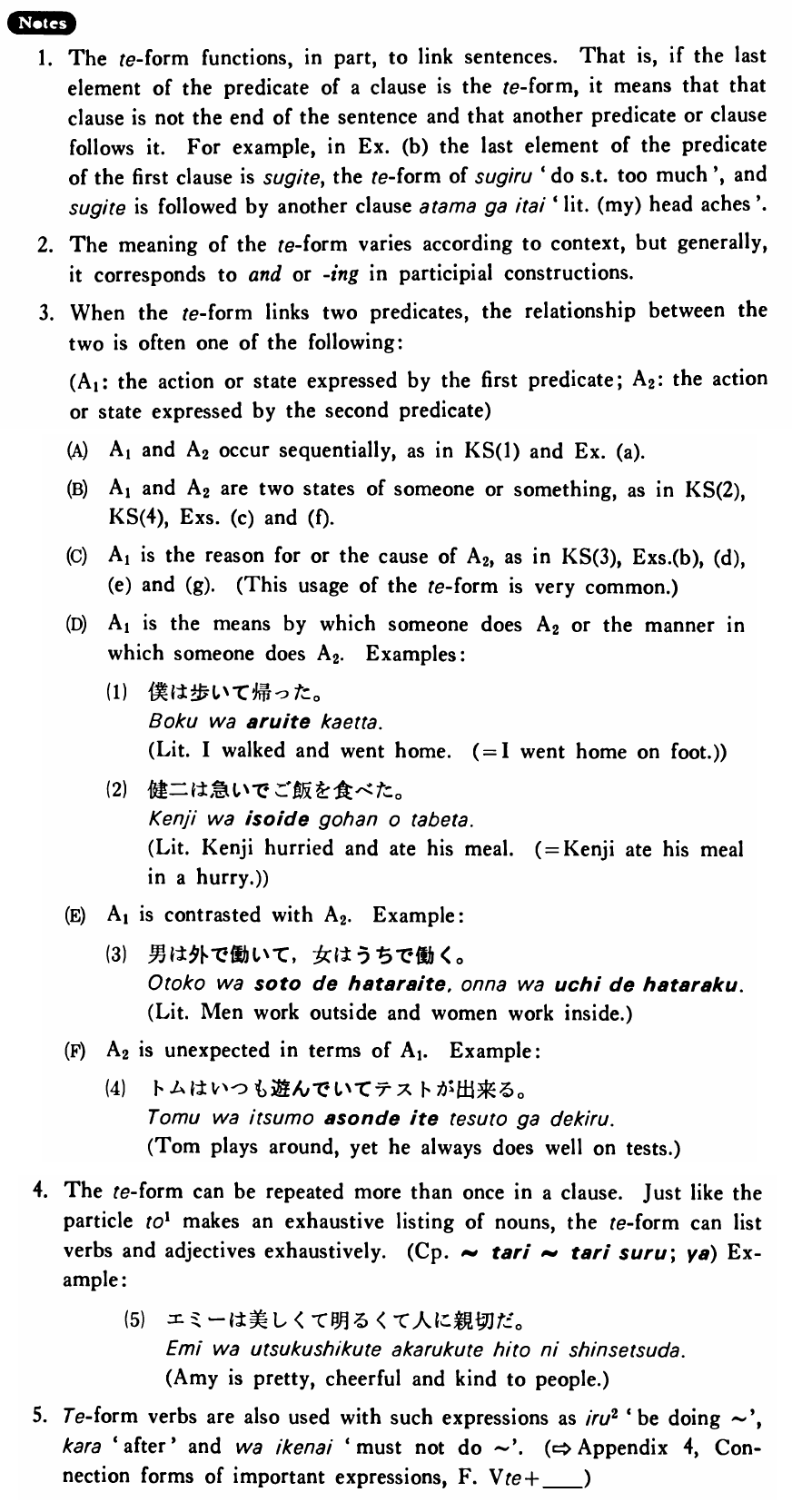 1. The て form functions, in part, to link sentences. That is, if the last element of the predicate of a clause is the て form, it means that that clause is not the end of the sentence and that another predicate or clause follows it. For example, in Example (b) the last element of the predicate of the first clause is 過ぎて, the て form of 過ぎる 'do something too much',and 過ぎて is followed by another clause 頭が痛い 'literally:(my) head aches'.