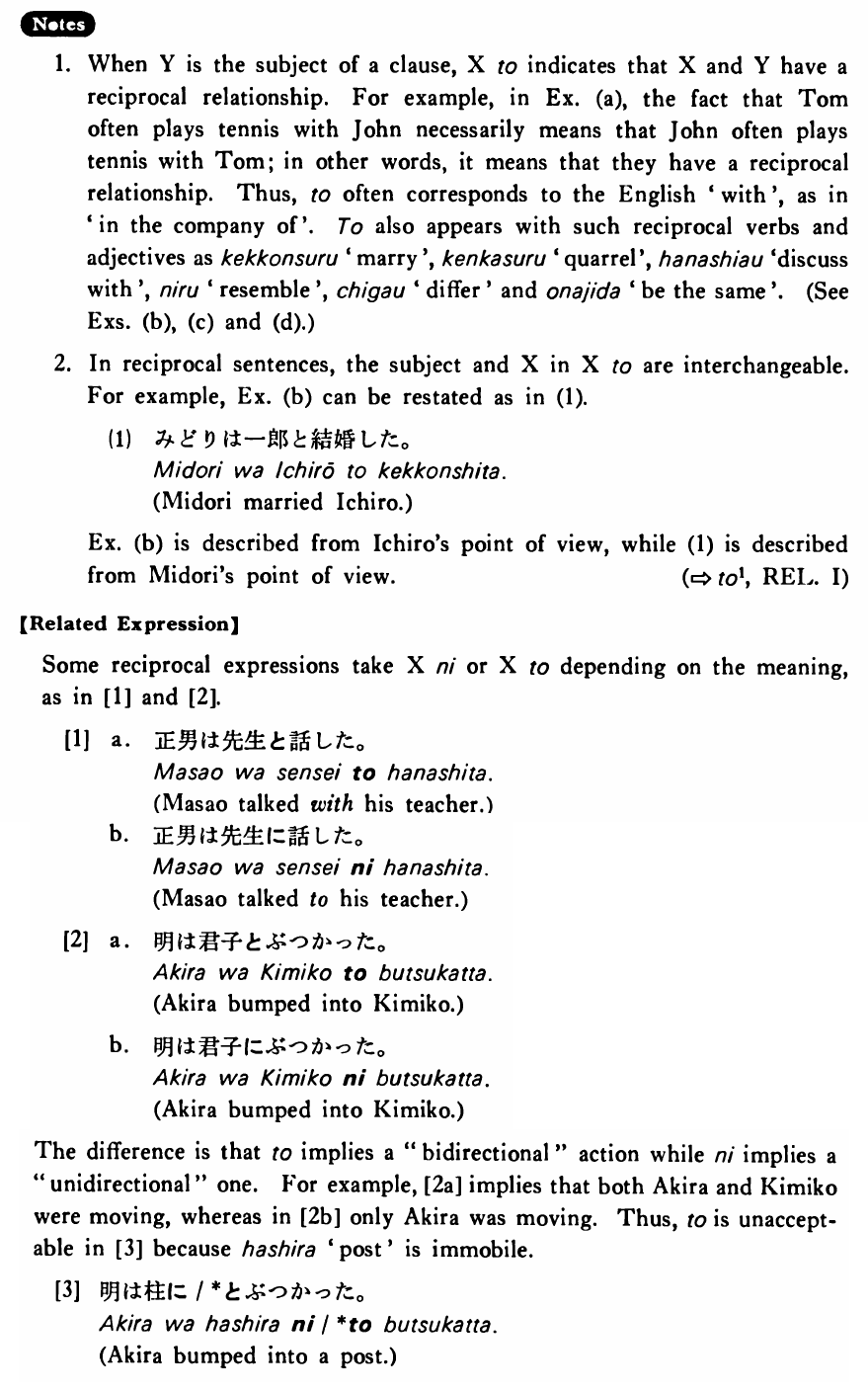 1. When Y is the subject of a clause, X to indicates that X and Y have a reciprocal relationship. For example, in Example (a), the fact that Tom often plays tennis with John necessarily means that John often plays tennis with Tom; in other words, it means that they have a reciprocal relationship. Thus, と often corresponds to the English 'with', as in 'in the company of'. と also appears with such reciprocal verbs and adjectives as 結婚する 'marry', 喧嘩する 'quarrel', 話し合う 'discuss with', 似る 'resemble', 違う 'differ' and 同じだ 'be the same'. (See Examples (b), (c) and (d).)