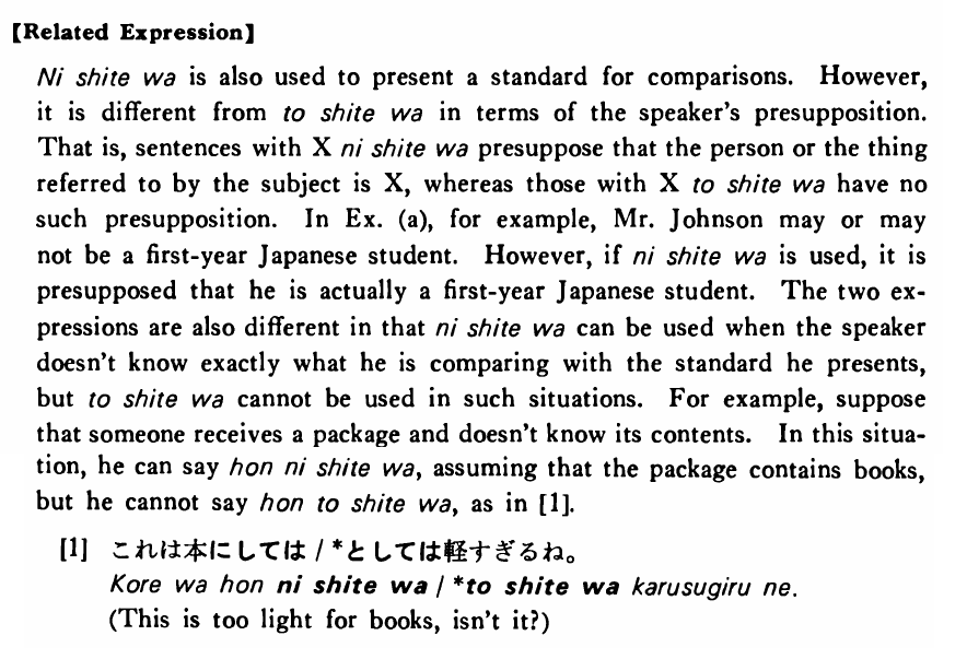 にしては is also used to present a standard for comparisons. However, it is different from としては in terms of the speaker's presupposition. That is, sentences with Xにしては presuppose that the person or the thing referred to by the subject is X, whereas those with Xとしては have no such presupposition. In Example (a), for example, Mr. Johnson may or may not be a first-year Japanese student. However, if にしては is used, it is presupposed that he is actually a first-year Japanese student. The two expressions are also different in that ni shite wa can be used when the speaker doesn't know exactly what he is comparing with the standard he presents, but としては cannot be used in such situations. For example, suppose that someone receives a package and doesn't know its contents. In this situation, he can say 本にしては, assuming that the package contains books, but he cannot say 本としては as in [1].