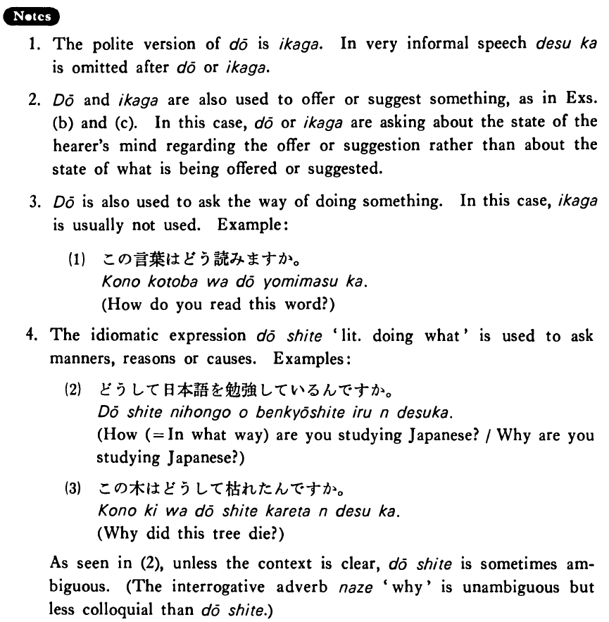4. The idiomatic expression どうして 'literally: doing what' is used to ask manners, reasons or causes. Examples: