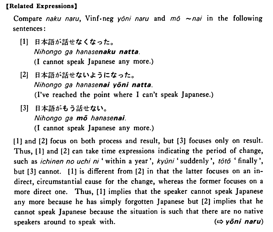 [1] and [2] focus on both process and result, but [3] focuses only on result. Thus, [1] and [2] can take time expressions indicating the period of change, such as 一年のうちに 'within a year', 急に 'suddenly', とうとう 'finally', but [3] cannot. [1] is different from [2] in that the latter focuses on an indirect, circumstantial cause for the change, whereas the former focuses on a more direct one. Thus, [1] implies that the speaker cannot speak Japanese any more because he has simply forgotten Japanese but [2] implies that he cannot speak Japanese because the situation is such that there are no native speakers around to speak with.
