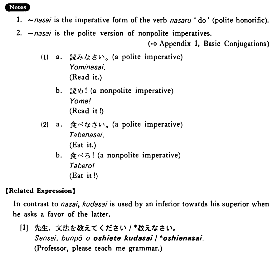 In contrast to なさい/ください is used by an inferior towards his superior when he asks a favor of the latter.