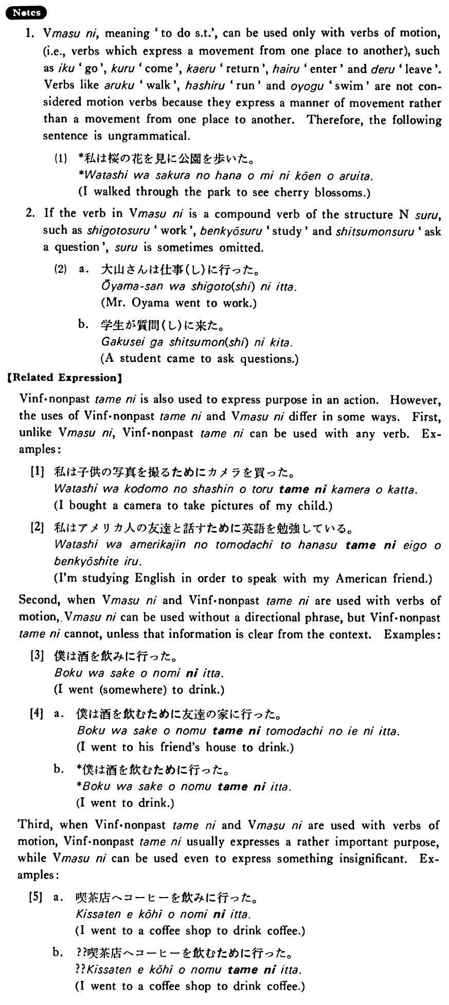 Second, when Verbますに and Verb informal nonpast為に are used with verbs of motion, Verbますに can be used without a directional phrase, but Verb informal nonpast為に cannot, unless that information is clear from the context. Examples: