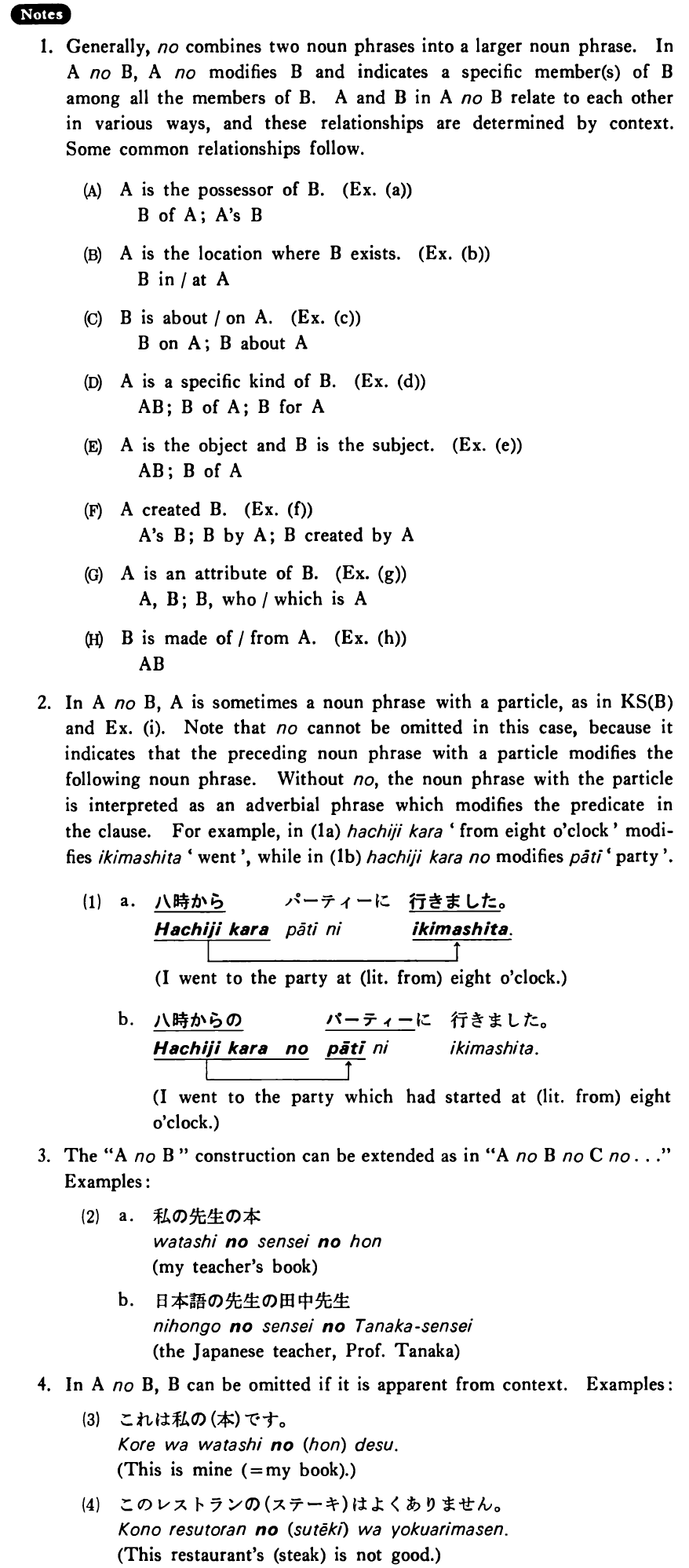 2. In AのB, A is sometimes a noun phrase with a particle, as in Key Sentence (B) and Example (i). Note that の cannot be omitted in this case, because it indicates that the preceding noun phrase with a particle modifies the following noun phrase. Without の, the noun phrase with the particle is interpreted as an adverbial phrase which modifies the predicate in the clause. For example, in (1a) 八時から 'from eight o'clock' modifies 行きました 'went', while in (1b) 八時からの modifies パーティー 'party'.