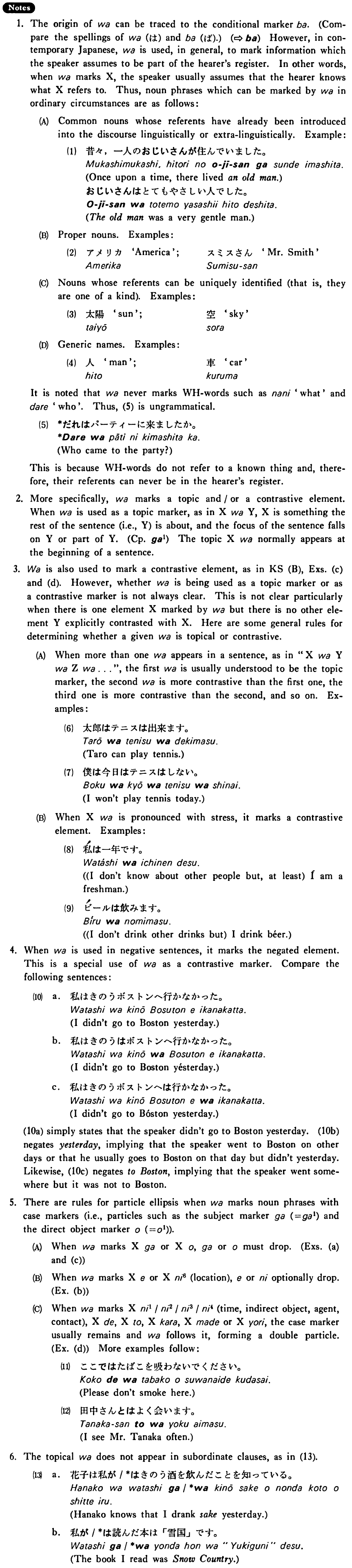 1. The origin of は can be traced to the conditional marker ば. (Compare the spellings of は and ば) (⇨ ば) However, in contemporary Japanese, は is used, in general, to mark information which the speaker assumes to be part of the hearer's register. In other words, when は marks X, the speaker usually assumes that the hearer knows what X refers to. Thus, noun phrases which can be marked by は in ordinary circumstances are as follows: