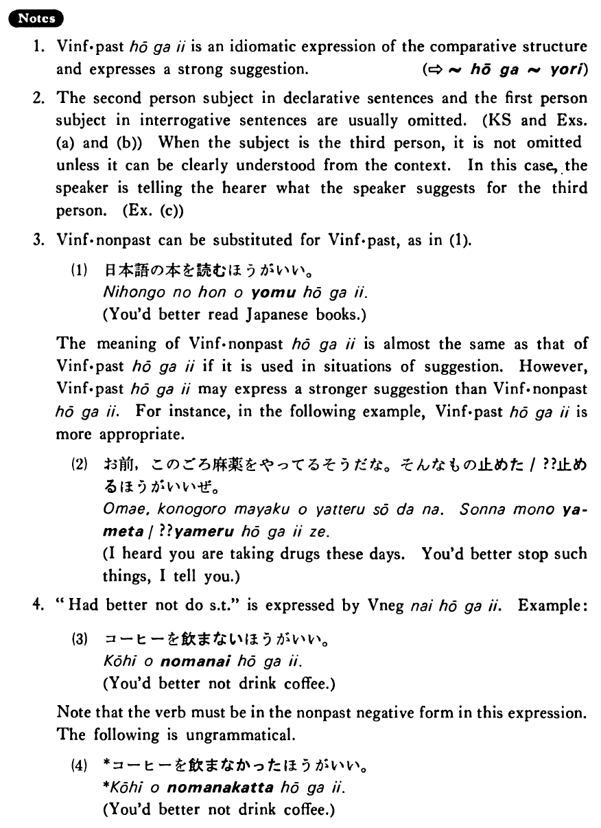4. "Had better not do something" is expressed by Verb negative ないほうがいい. Example: