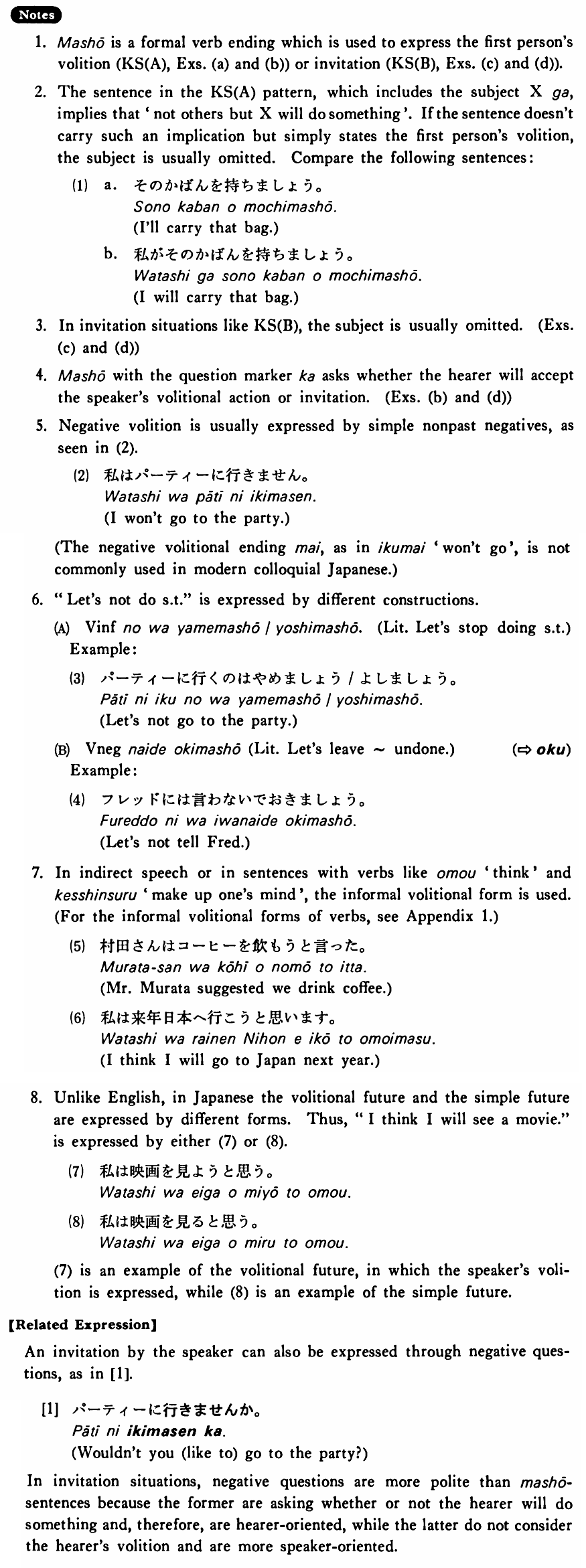 8. Unlike English, in Japanese the volitional future and the simple future are expressed by different forms. Thus, "I think I will see a movie." is expressed by either (7) or (8).