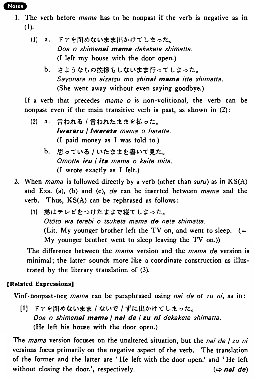 2. When まま is followed directly by a verb (other than する) as in Key Sentence (A) and Example (a), (b) and (e), で can be inserted between まま and the verb. Thus, Key Sentence (A) can be rephrased as follows: