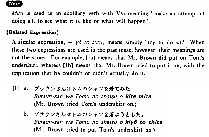 A similar expression, ようとする, means simply 'try to do something'. When these two expressions are used in the past tense, however, their meanings are not the same. For example, [1a] means that Mr. Brown did put on Tom's undershirt, whereas [1b] means that Mr. Brown tried to put it on, with the implication that he couldn't or didn't actually do it.