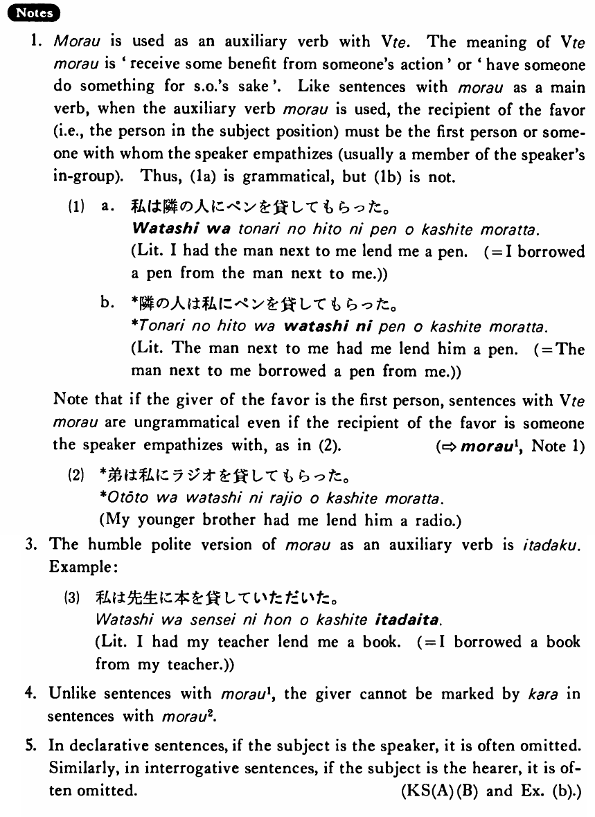 4. Unlike sentences with もらう1, the giver cannot be marked by から in sentences with もらう2.