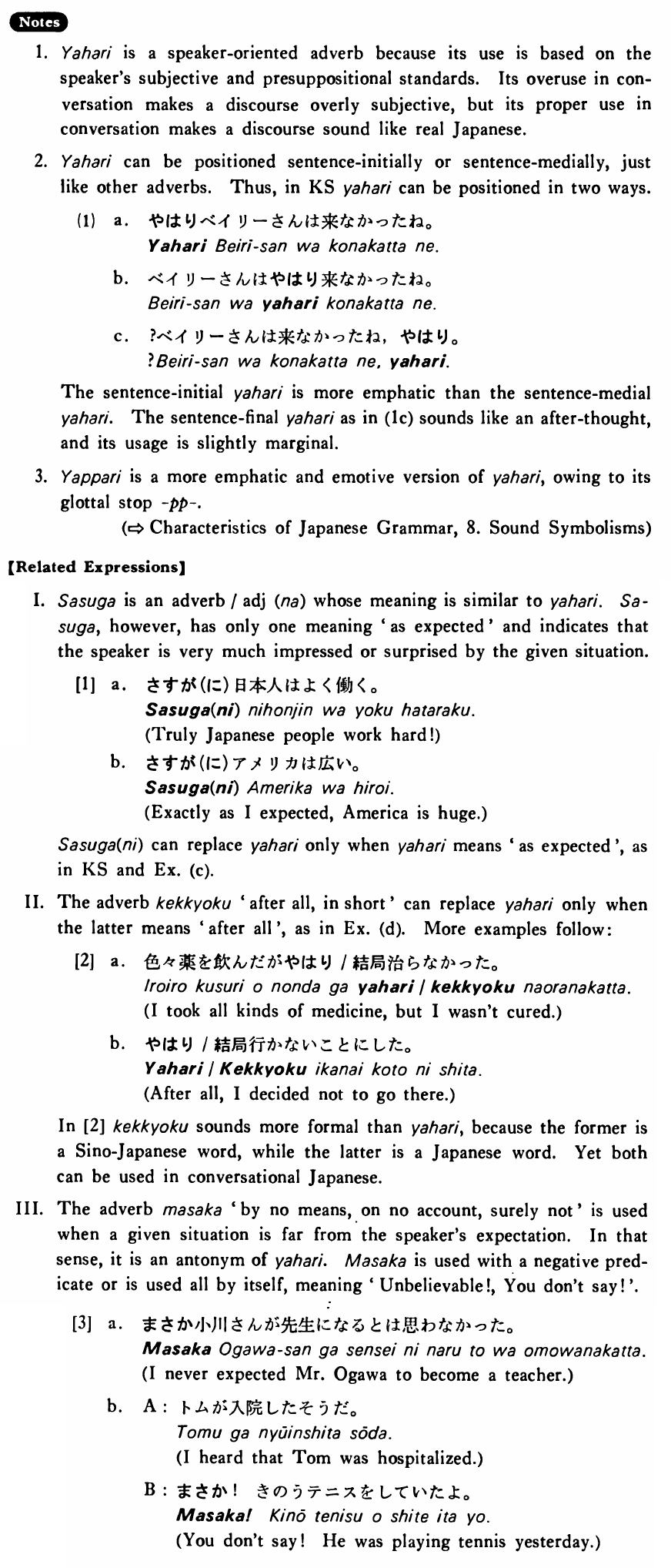 II. The adverb 結局 'after all, in short' can replace やはり only when the latter means 'after all', as in Example (d). More examples follow: