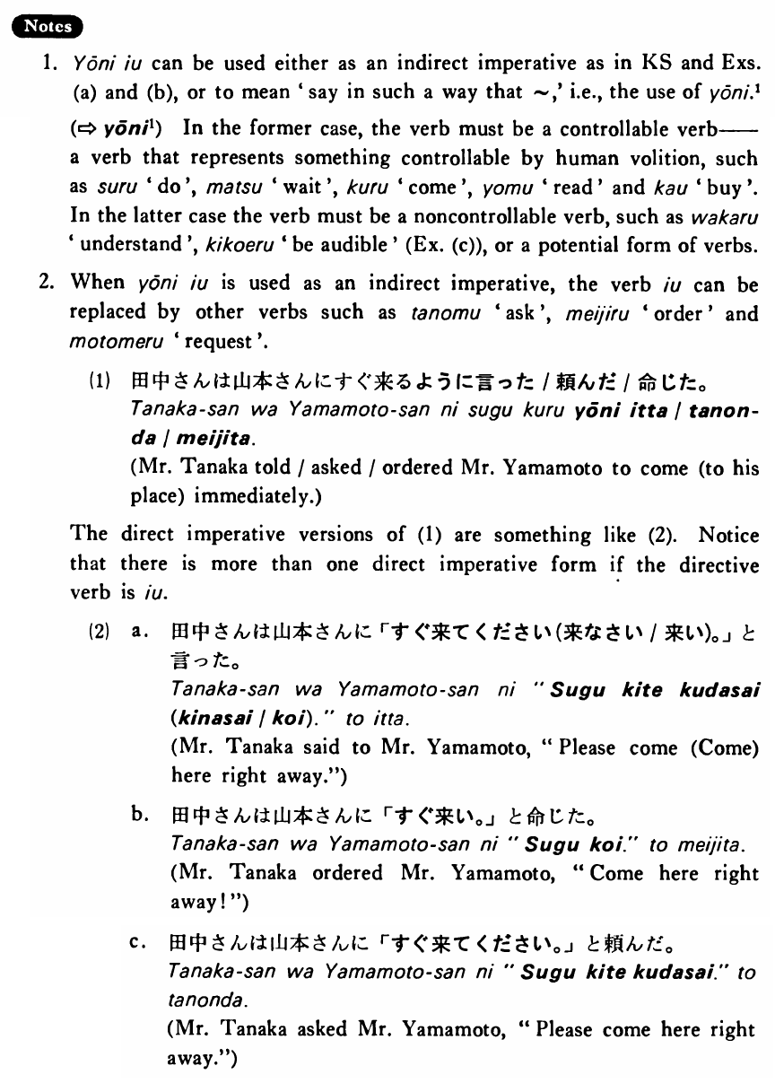 1. ように言う can be used either as an indirect imperative as in Key Sentence and Examples (a) and (b), or to mean 'say in such a way that ~,' i.e., the use of ように1 (⇨ ように1) In the former case, the verb must be a controllable verb a verb that represents something controllable by human volition, such as する 'do', 待つ 'wait', 来る 'come', 読む 'read' and 買う 'buy'. In the latter case the verb must be a noncontrollable verb, such as 分かる 'understand', 聞こえる 'be audible' (Example (c)), or a potential form of verbs.