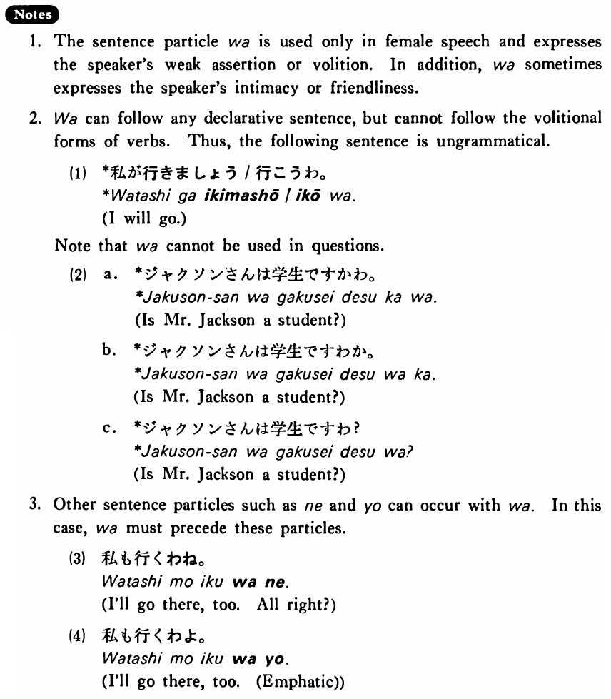 1. The sentence particle わ is used only in female speech and expresses the speaker's weak assertion or volition. In addition, わ sometimes expresses the speaker's intimacy or friendliness.