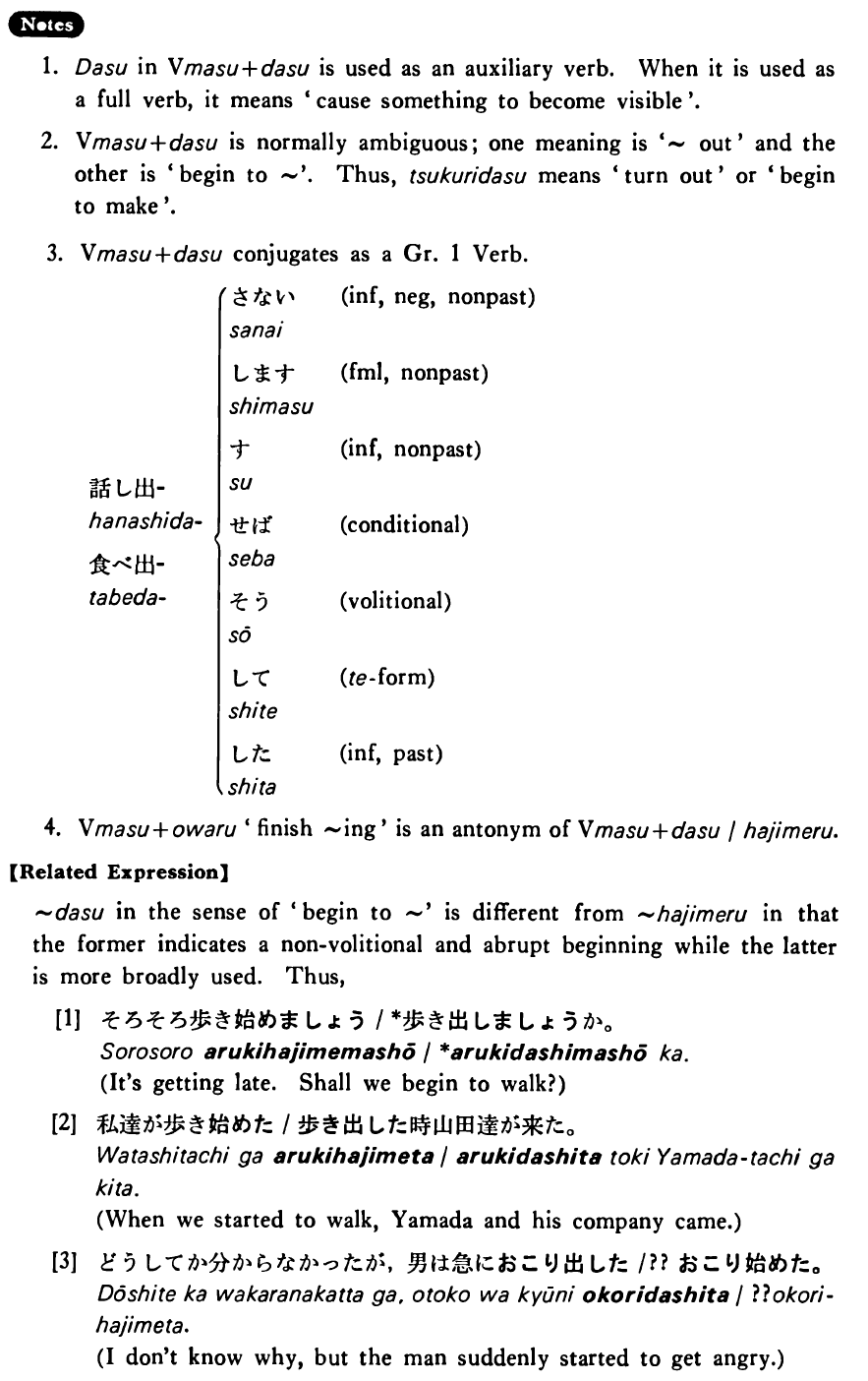 1. 出す in Verbます+出す is used as an auxiliary verb. When it is used as a full verb, it means 'cause something to become visible'.