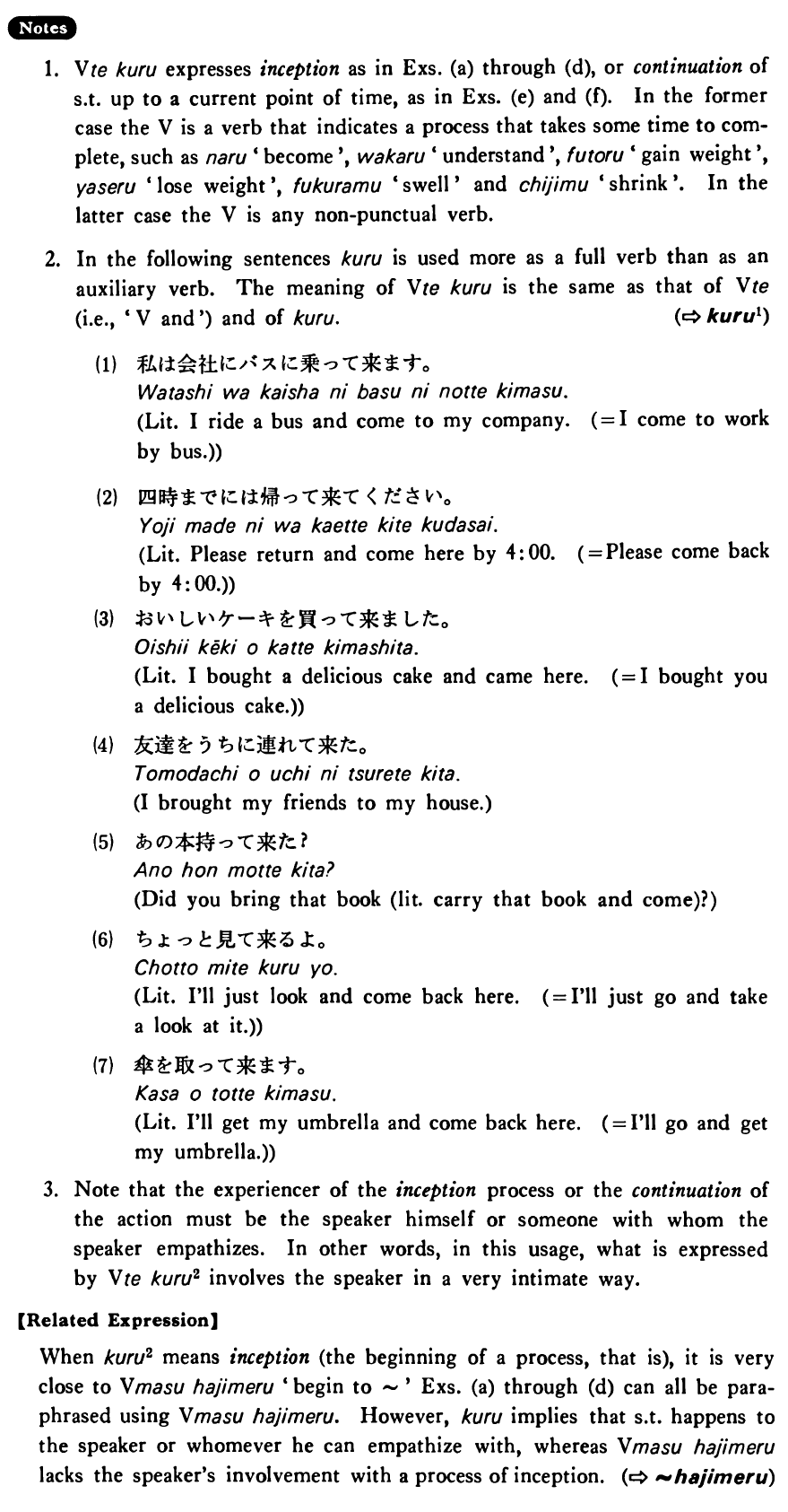 2. In the following sentences 来る is used more as a full verb than as an auxiliary verb. The meaning of Verbて来る is the same as that of Verbて (i.e., 'Verb and') and of 来る.
