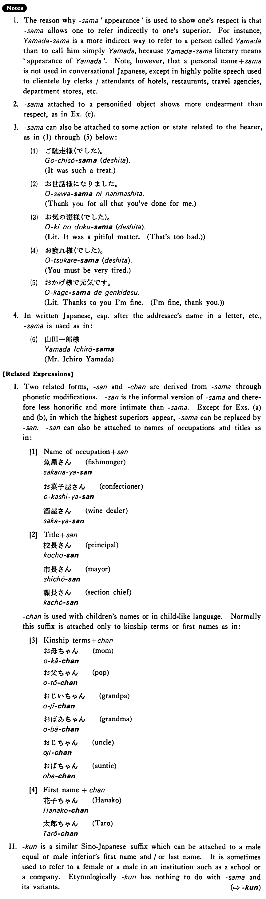 I. Two related forms, さん and ちゃん are derived from 様 through phonetic modifications. さん is the informal version of 様 and therefore less honorific and more intimate than 様. Except for Examples (a) and (b), in which the highest superiors appear, 様 can be replaced by さん. さん can also be attached to names of occupations and titles as in: