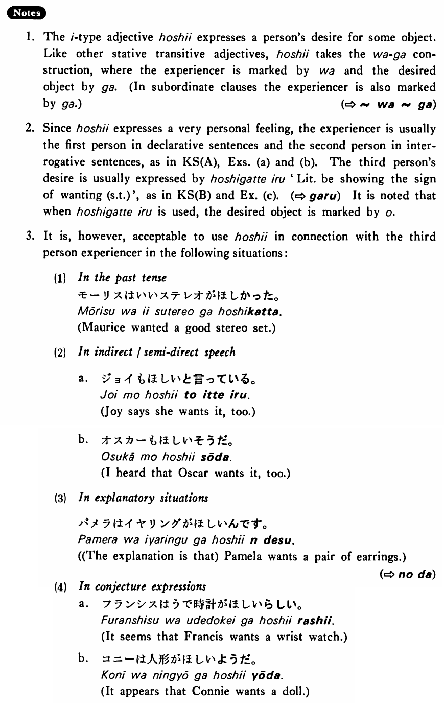 2. Since 欲しい expresses a very personal feelings the experiencer is usually the first person in declarative sentences and the second person in interrogative sentences, as in Key Sentence (A), Examples (a) and (b). The third person's desire is usually expressed by 欲しがっている 'Literally: be showing the sign of wanting (something)', as in Key Sentence (B) and Example (c). (⇨ がる) It is noted that when 欲しがっている is used, the desired object is marked by を.