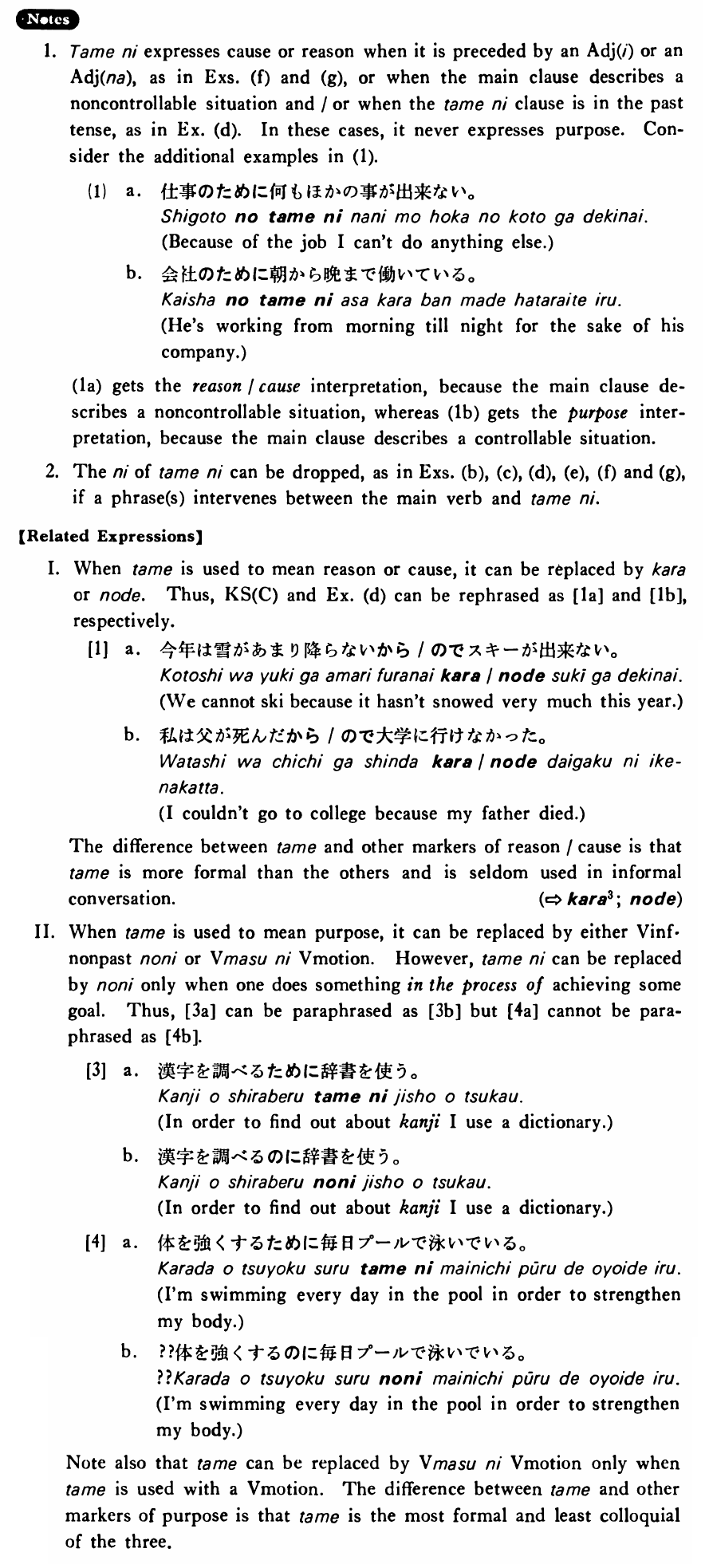 1. 為に expresses cause or reason when it is preceded by an Adjective い or an Adjective な, as in Examples (f) and (g), or when the main clause describes a noncontrollable situation and/or when the 為に clause is in the past tense, as in Example (d). In these cases, it never expresses purpose. Consider the additional examples in (1).