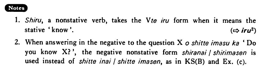 (⇨ いる2)2. When answering in the negative to the question Xを知っていますか 'Do you know X?', the negative nonstative form 知らない/知りません is used instead of 知っていない/知っていません, as in Key Sentence (B) and Example (c).